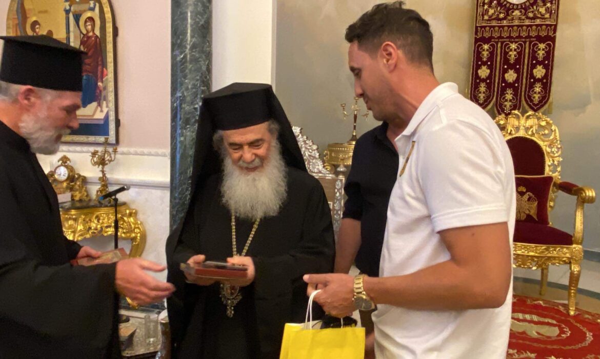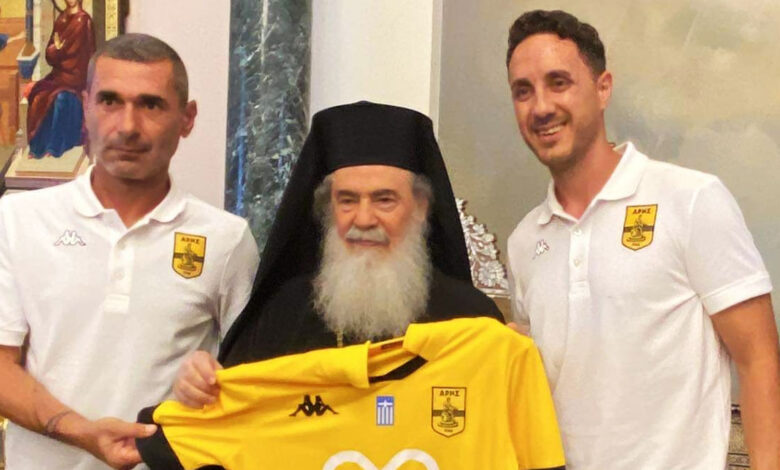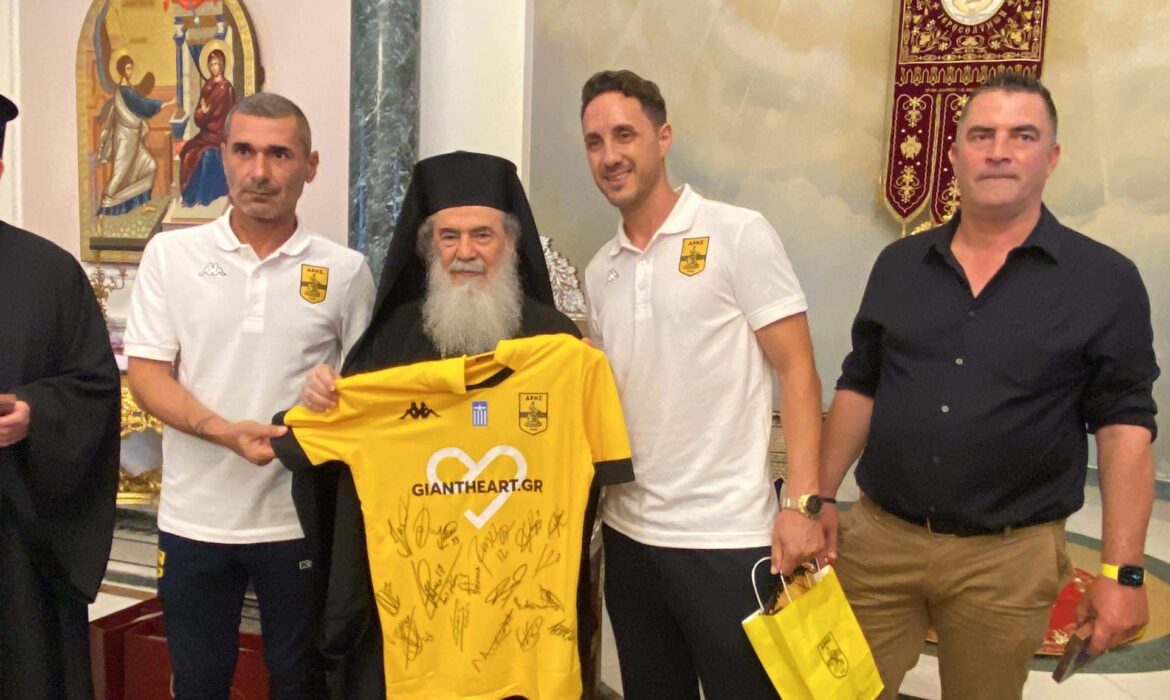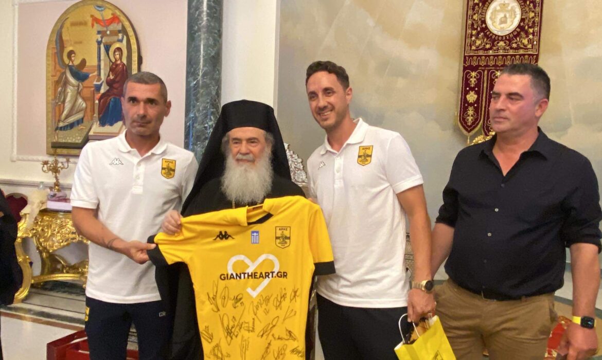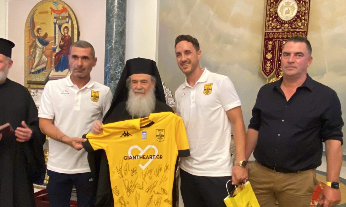 Μάλιστα, δόθηκε και φανέλα του Άρη στον Πατριάρχη, όπως έγινε και την τελευταία φορά που η αποστολή της ομάδας βρέθηκε στους Άγιους Τόπους.