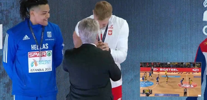 Την ώρα που μεταδιδόταν το Άρης-Περιστέρι, ξαφνικά το ματς μπήκε σε… παραθυράκι. Στην ΕΡΤ προχώρησαν σε αυτή την ενέργεια για να δείξουν το μετάλλιο που πήρε ο Έλληνας αθλητής, Καραλής αλλά είναι άγνωστο αν θα έκαναν το ίδιο εφόσον Παναθηναϊκός και Ολυμπιακός έδιναν ένα σημαντικό παιχνίδι.