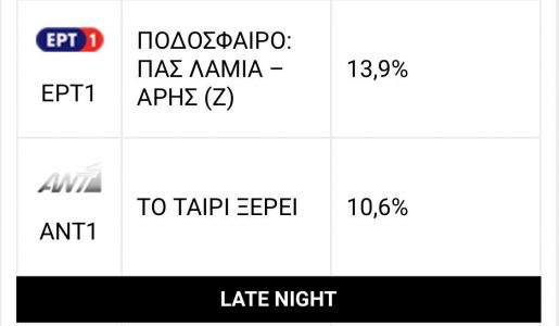 Ο αγώνας με την Λαμία συγκέντρωσε το μεγαλύτερο μέρος της τηλεοπτικής πίτας, καθώς είχε μέσο όρο 13.9%! Στην prime time ζώνη αυτό μεταφράζεται σε 500.000 τηλεθεατές!