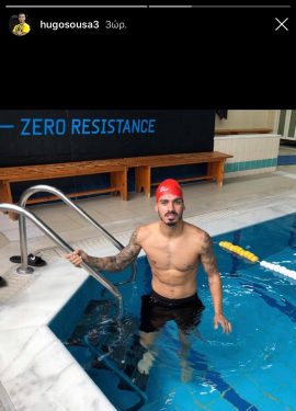 Ο Πορτογάλος αμυντικός του Άρη ανάρτησε δύο φωτογραφίες στο προσωπικό του λογαριασμό στο Instagram από την αποθεραπεία του, στην οποία χρησιμοποιεί μια ειδική μάσκα, ενώ εκτελεί ειδικό πρόγραμμα ασκήσεων σε πισίνα.