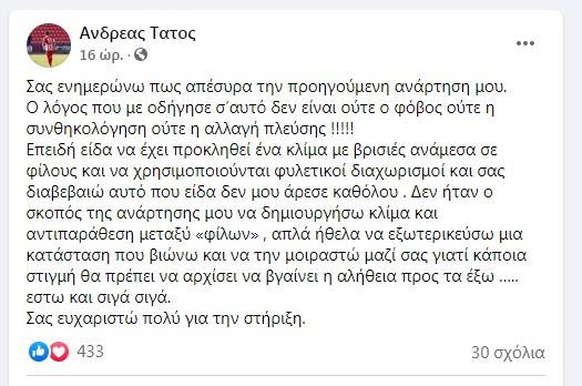 Ο Ανδρέας Τάτος δημοσίευσε ξανά στα social media, εξηγώντας τον λόγο που κατέβασε την προηγούμενη του ανάρτηση.