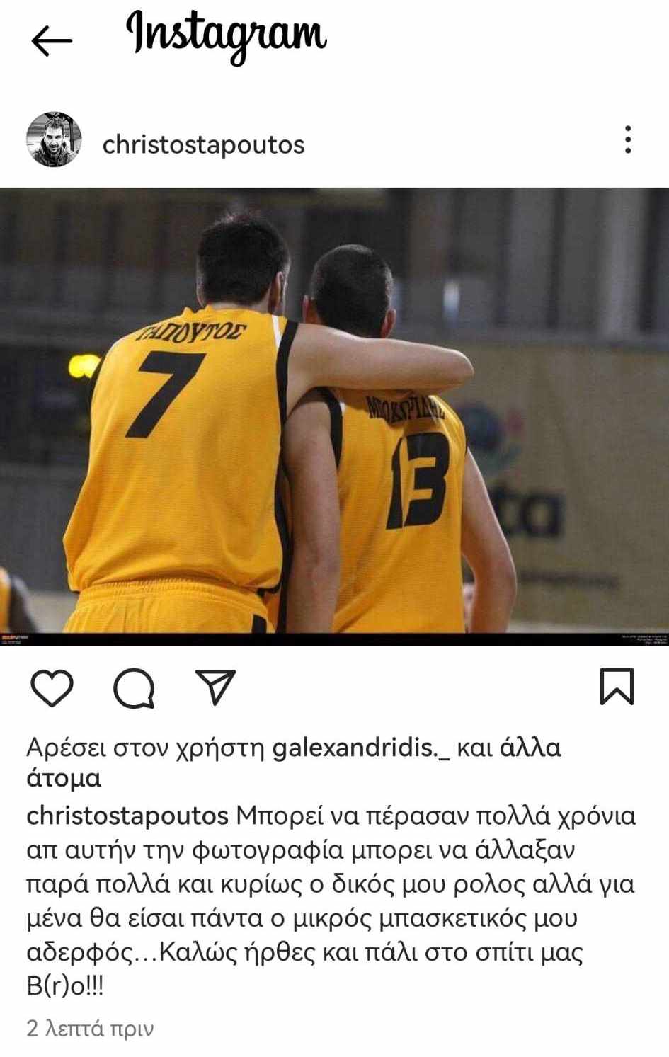 “Μπορεί να πέρασαν πολλά χρόνια απ αυτήν την φωτογραφία μπορει να άλλαξαν παρά πολλά και κυρίως ο δικός μου ρολος αλλά για μένα θα είσαι πάντα ο μικρός μπασκετικός μου αδερφός…Καλώς ήρθες και πάλι στο σπίτι μας B(r)o!!!”.