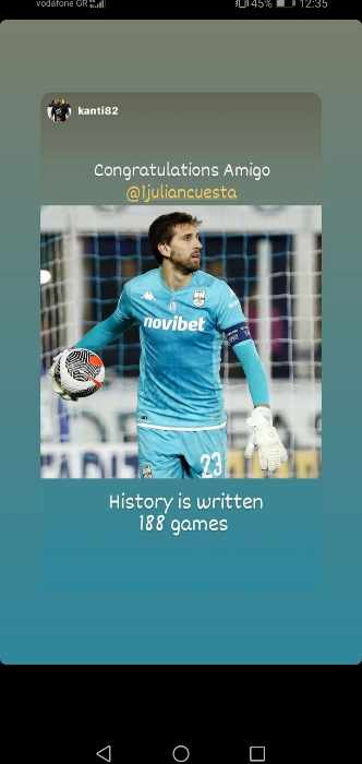 Ο Χουλιάν Κουέστα έγινε ο ξένος με τις περισσότερες συμμετοχές στην ιστορία του Άρη, με τον Γιώργο Καντιμοίρη να τον συγχαίρει μέσω ανάρτησης στα μέσα κοινωνικής δικτύωσης, για αυτές τις 188 συμμετοχές.