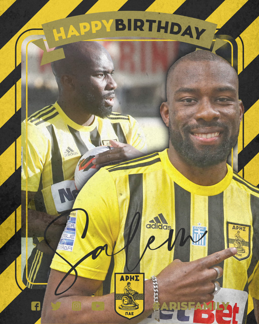 Τα γενέθλιά του έχει σήμερα ο Σαλέμ Εμπακατά και η ΠΑΕ Άρης του εύχεται τα καλύτερα. Φυσικά, μέσω τον social media ο Κογκολέζος αμυντικός δέχεται πάρα πολλές ευχές και από τον κόσμο του Άρη.