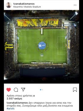 Με δυο φωτογραφίες μια πανοραμική του γηπέδου και ένα στιγμιότυπο του αγώνα βρήκε την αφορμή να ευχαρίστηση τον λαό των «κιτρινόμαυρων», γράφοντας: