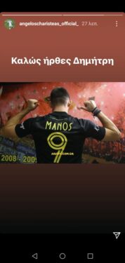 Ο Άγγελος Χαριστέας έσπευσε σήμερα να τον καλωσορίσει στην ομάδα και μέσω του διαδικτύου δημοσιεύοντας στον προσωπικό του λογαριασμό στο intagram τον Μάνο με την νέα του φανέλα γράφοντας: «Καλώς όρισες Δημήτρη!»