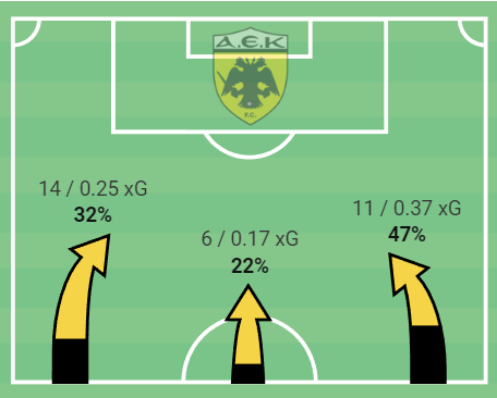 Ενώ και στα δεξιά είχε πρόβλημα ο Άρης, οι επιθέσεις που δεχόταν από την αριστερή του πλευρά ήταν οι πιο επικίνδυνες, αλλά και ήταν οι περισσότερο απειλητικές σε open-play, παρά το ότι ήταν λιγότερες από αυτές που δέχθηκε στα δεξιά.