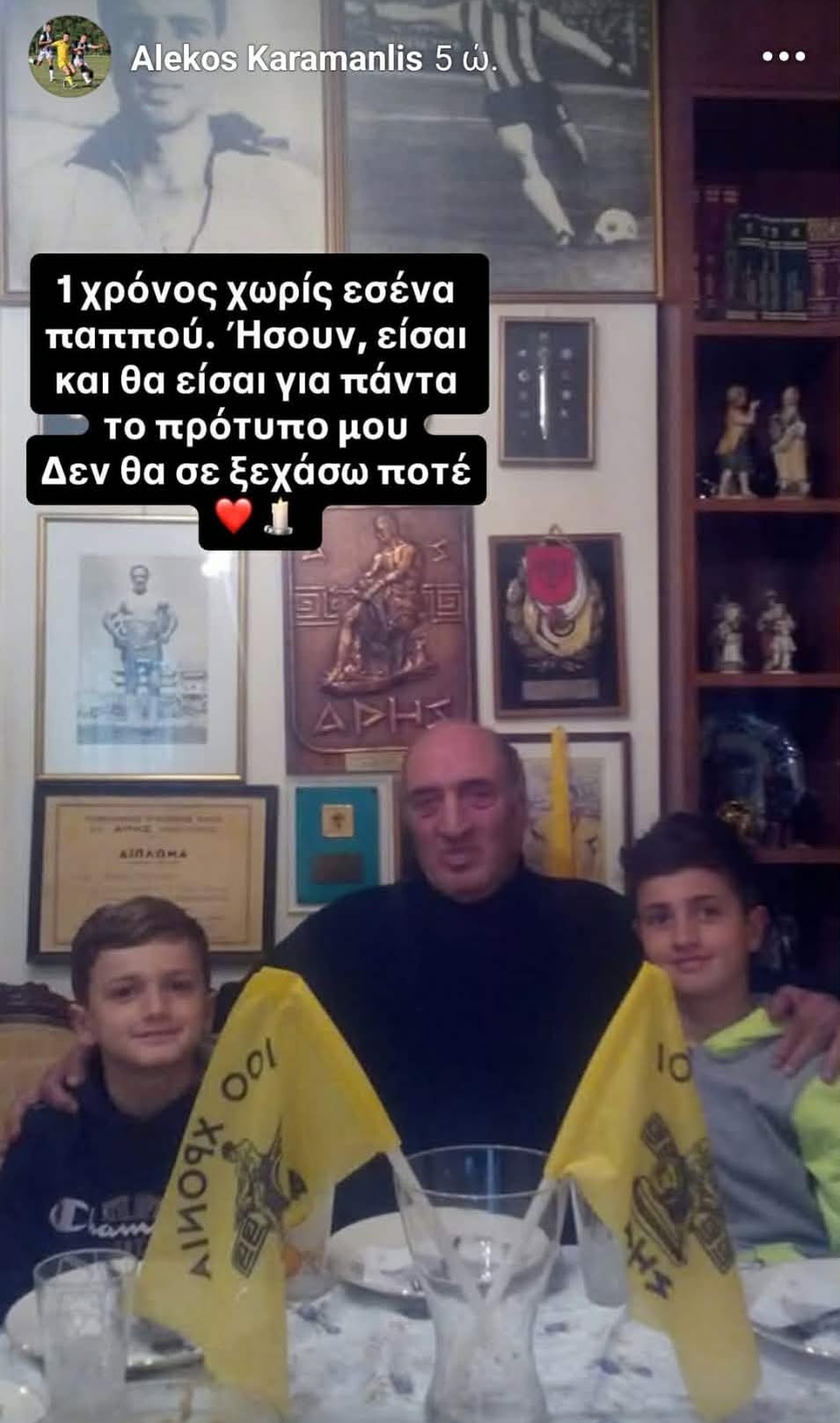 Με αφορμή τη συμπλήρωση ενός έτους από το θάνατό του, ο εγγονός του, που έχει και το όνομά του, ο Αλέκος Καραμανλής, μέλος της Κ19 του Άρη, έκανε μία συγκινητική ανάρτηση στα social media.