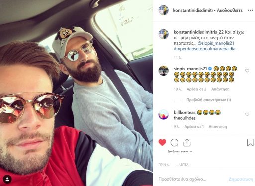 Ο φίλος και συμπαίκτης του, Δημήτρης Κωνσταντινίδης, αποφάσισε για άλλη μια φορά να τον τρολάρει ανεβάζοντας μια κοινή τους φωτογραφία και γράφοντας «Και σ’ έχω πει να μην μιλάς στο κινητό όταν περπατάς…», με τον βραχύσωμο διεθνή να απαντάει με πολλά emoji που γελάνε.