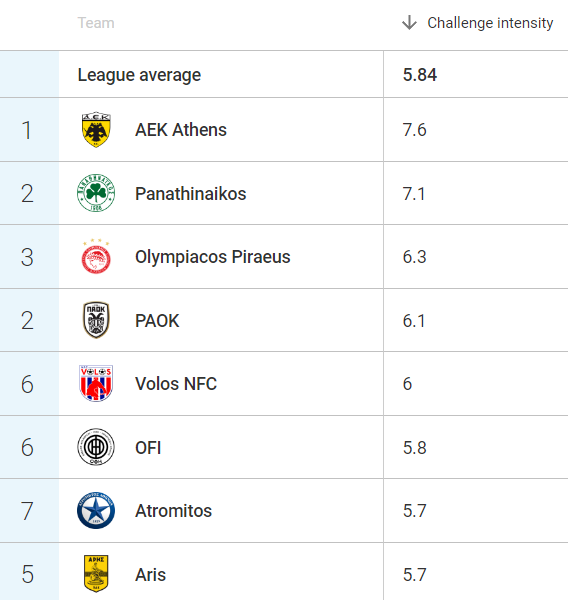 Ουσιαστικά πιο ψηλά βρίσκονται οι ομάδες που παίζουν με high block και πιέζουν μετά τα λάθη τους για να επανακτήσουν την μπάλα, με την ΑΕΚ να είναι στην κορυφή με δείκτη 7,6.