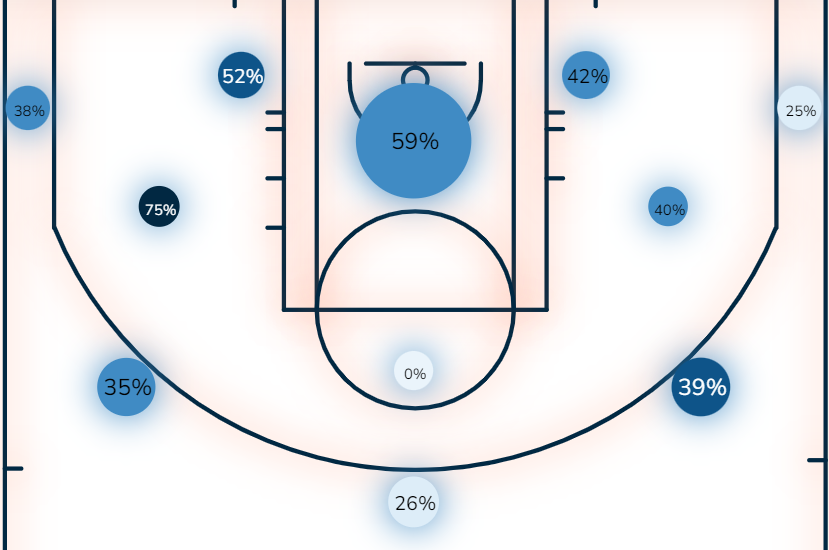 Σε ότι έχει να κάνει με το τρίποντο τα καλύτερα ποσοστά του είναι από τα φτερά (35% και 39% αριστερά και δεξιά αντίστοιχα) ενώ μένει μόλις στο 26% από την κορυφή.