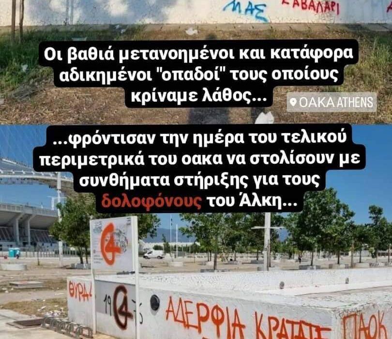 Μέσα σε όλα τα τραγικά που συνέβησαν, ξεχώρισαν αρνητικά μερικά συνθήματα έξω από το ΟΑΚΑ. Συνθήματα (προφανώς) γραμμένα από πλευράς κόσμου του ΠΑΟΚ με το μήνυμα «Λευτεριά στα αδέρφια μας» το οποίο χρησιμοποιείται εδώ και μήνες για τους δολοφόνους του Άλκη Καμπανού.