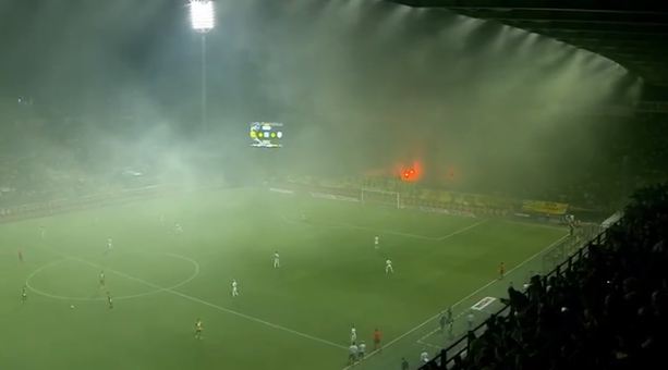 Mικρή καθυστέρηση για την έναρξη του ντέρμπι… Αφορμή γι’ αυτό ήταν τα βεγγαλικά που άναψαν, με τον κόσμο του Άρη να “φτιάχνει” μια εκπληκτική ατμόσφαιρα στο γήπεδο. Ο αγωνιστικός χώρος “κρύφτηκε” από τον καπνό, όπως βλέπετε από φωτογραφία, πάνω από το στάδιο των “κιτρίνων”.