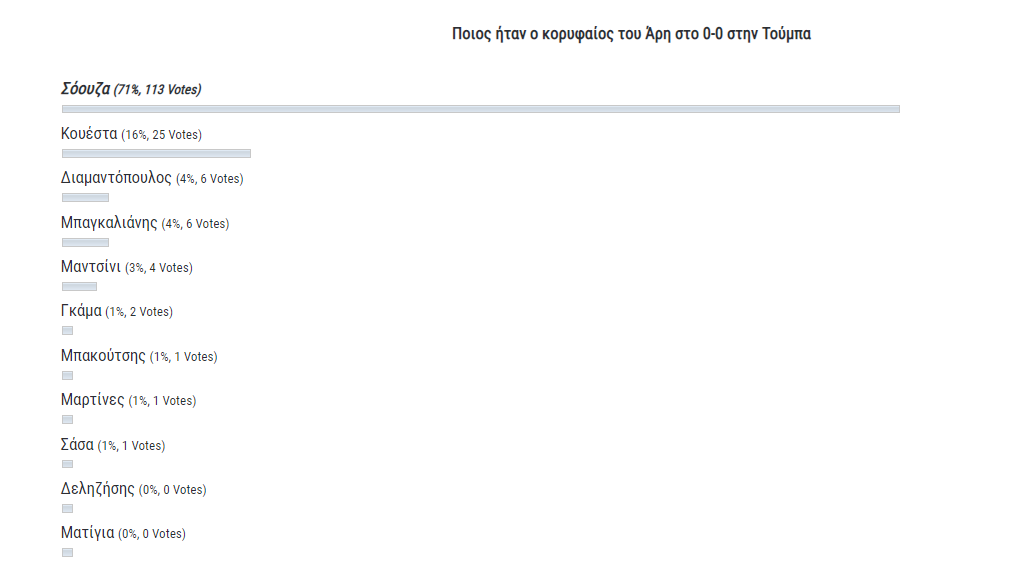 Ακολούθησε ο Κουέστα με 16% και οι Διαμαντόπουλος, Μπαγκαλιάνης που είχαν από 4%.