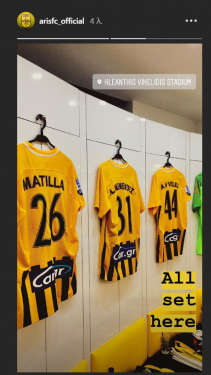 Η ΠΑΕ Άρης ανάρτησε στα social media φωτογραφία από τα αποδυτήρια με τις κρεμασμένες φανέλες των παικτών.