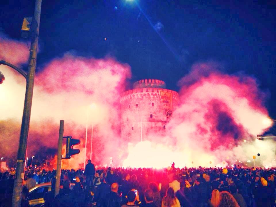 Την μέρα αυτήν ο κόσμος του Άρη σε μία πολύ δύσκολη έδωσε ραντεβού αρχικά στο Αλεξάνδρειο και στην συνέχεια στον Λευκό Πύργο, για να φτιάξει ένα εντυπωσιακό σόου με πυρσούς, το οποίο έκανε… την νύχτα μέρα σε όλη την Θεσσαλονίκη!