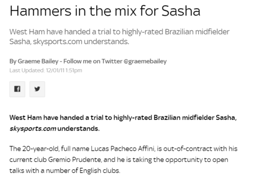 Σύμφωνα με δημοσίευμα της Αγγλικής Daily Mail, ο Λούκας Σάσα δοκιμάστηκε από τη Γουέστ Χαμ τον Ιανουάριο του 2011 όταν έληξε το συμβόλαιο του με τη Γκρέμιο Μπαρουέρι.