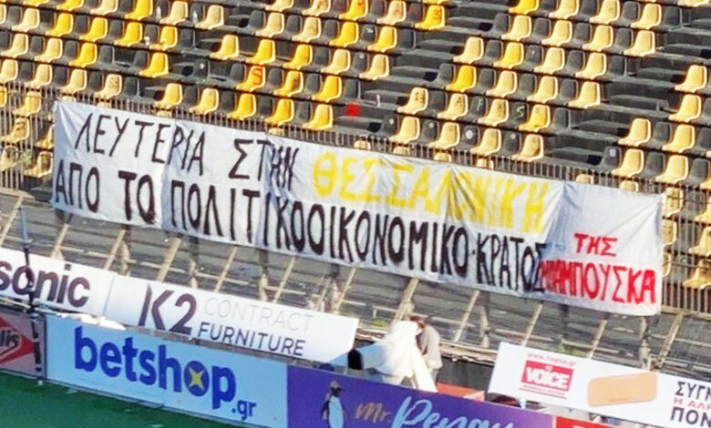 Μηνύματα με πάρα πολλούς αποδέκτες έστειλαν οι κιτρινόμαυροι στο σημερινό ντέρμπι. «Λευτεριά στην Θεσσαλονίκη από το πολιτικοοικονομικό κράτος της μπαμπούσκα»…