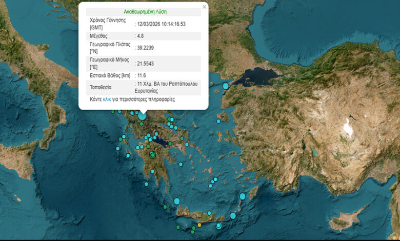 Σύμφωνα με το Γεωδυναμικό Ινστιτούτο του Εθνικού Αστεροσκοπείου Αθηνών, η δόνηση σημειώθηκε 11 χιλιόμετρα βορειοανατολικά του Ραπτόπουλου Ευρυτανίας Πηγή: www.reporter724.com