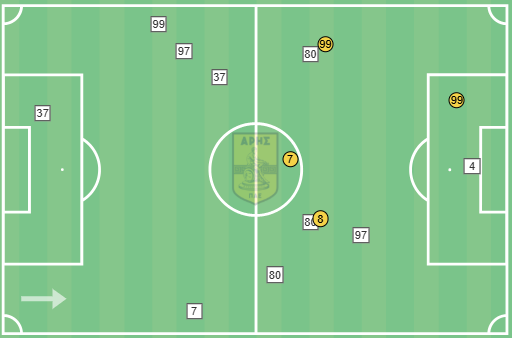 Αυτό σημαίνει προφανώς ότι ο Άρης δεν μπόρεσε να δημιουργήσει λάθη και κάπως έτσι εξηγείται η σπάνια παρουσία του μπροστά από τη μεσαία γραμμή και το 40% στην κατοχή.