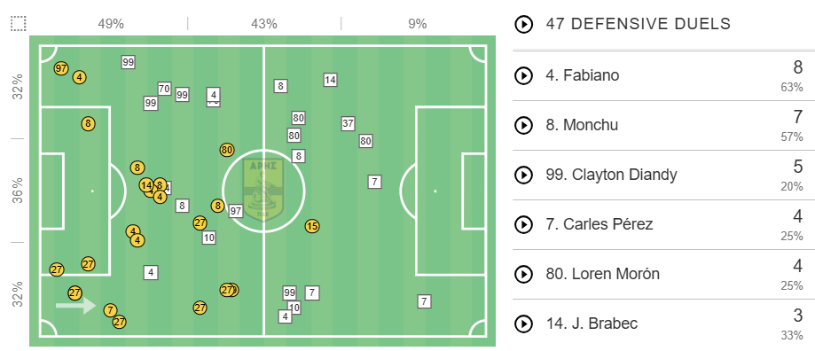 Φωτεινή εξαίρεση ήταν ο Φαντιγκά που κέρδισε τις οκτώ μονομαχίες στις οποίες έλαβε μέρος, ενώ οι Φαμπιιάνο και Μόντσου είχαν θετικό ποσοστό. Όλοι οι υπόλοιποι παίκτες του Άρη αντιμετώπισαν προβλήματα, με την ομάδα να κερδίζει μόλις μία(!) αμυντική μονομαχίες μπροστά από το κέντρο.