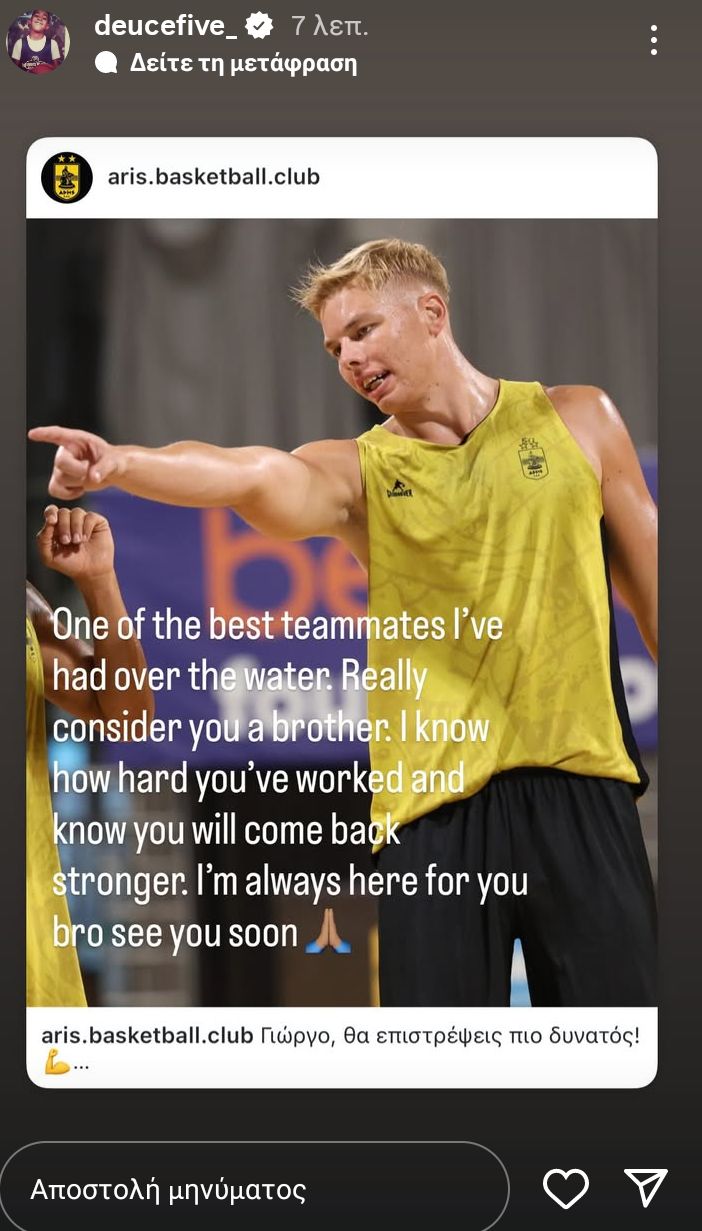 “Ένας από τους καλύτερους συμπαίκτες που είχα”, έγραψε αρχικά και στην απευθυνόμενος στον Τανούλη, πρόσθεσε: “Σε θεωρώ πραγματικά αδερφό. Ξέρω ότι έχεις δουλέψει σκληρά και ξέρεις ότι θα επιστρέψεις πιο δυνατός. Είμαι πάντα εδώ για σένα, φίλε τα λέμε σύντομα”.