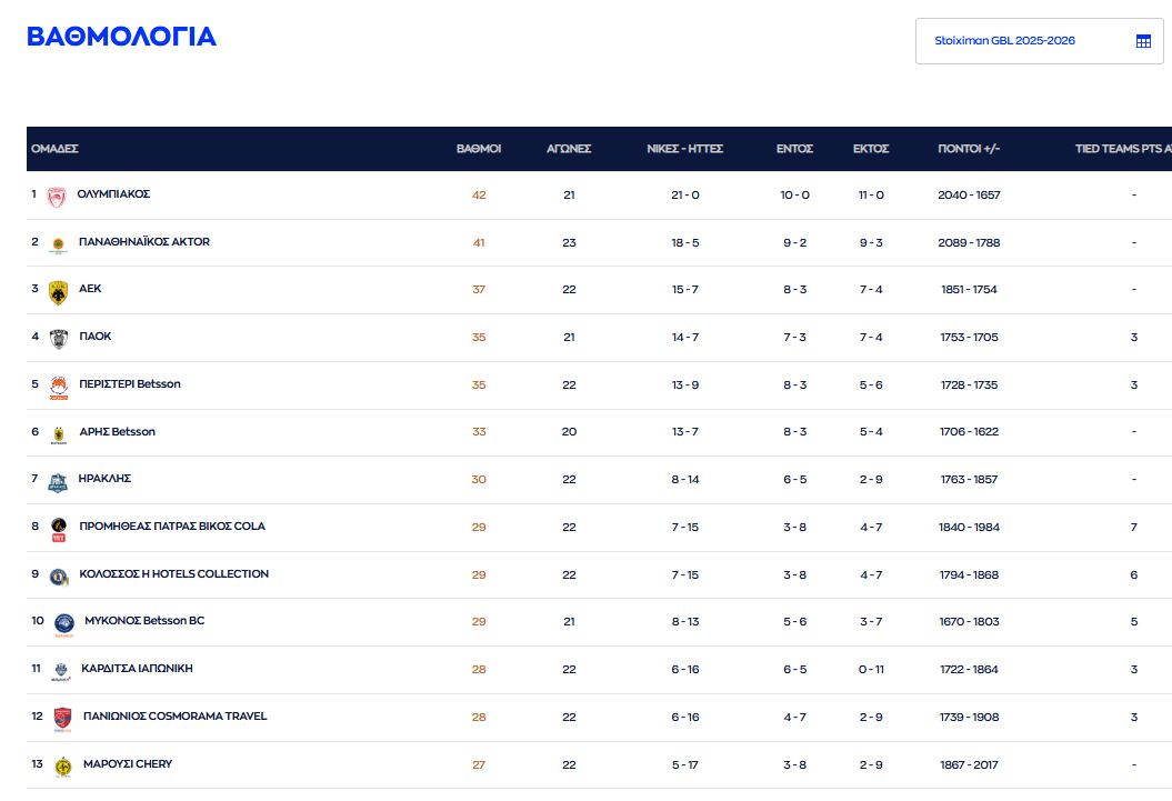 Η βαθμολογία της GBL μετά τα παιχνίδια του Σαββάτου