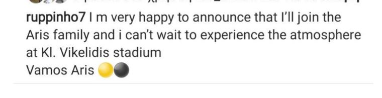 “Είμαι πολύ χαρούμενος που ανακοινώνω ότι θα γίνω μέλος της οικογένειας του Άρη και ανυπομονώ να ζήσω την ατμόσφαιρα στο γήπεδο Κλεάνθης Βικελίδης. Vamos Aris”.