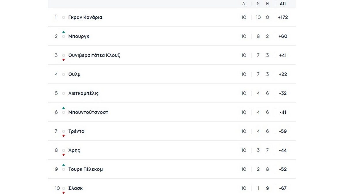 Πλέον έχουν γίνει 10 ματς στο Eurocup και παρακάτω μπορείτε να δείτε την βαθμολογία στον όμιλο του Άρη.
