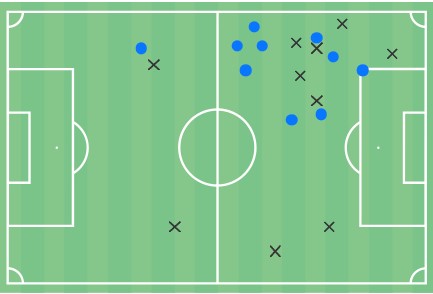 Βοήθησε στο κομμάτι της δημιουργίας, έχοντας επιχειρήσει 64 πάσες με ποσοστό επιτυχίας 73,4%, ενώ γενικά προώθησε το παιχνίδι για την ομάδα του.