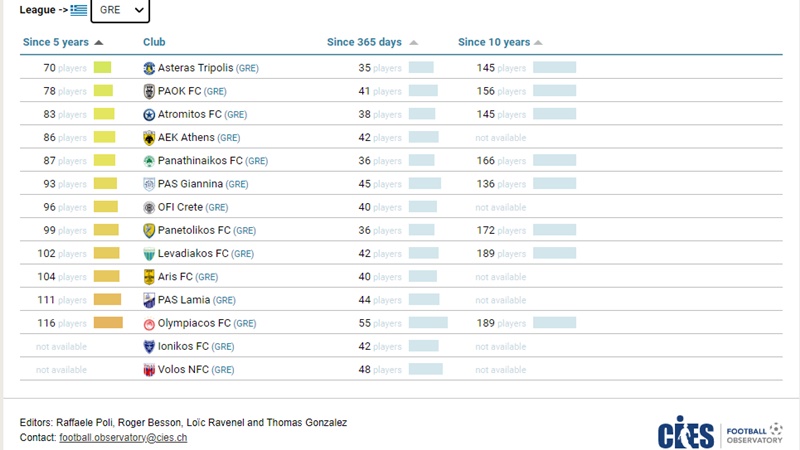 H έκθεση του CIES Football Observatory δημοσίευσε μια λίστα σχετικά με τους παίκτες που χρησιμοποιήθηκαν από ελληνικές ομάδες.