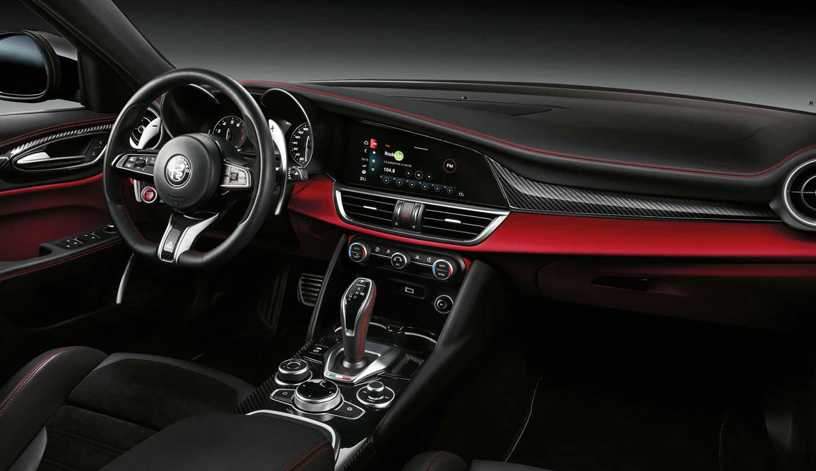 Στο εσωτερικό πρωταγωνιστεί η κεντρική οθόνη αφής 8,8″ με το νέο σύστημα πολυμέσων. Αυτό έχει νέα γραφικά και λειτουργίες που σχεδιάστηκαν αποκλειστικά για τις Quadrifoglio επιτρέποντας στον οδηγό να ελέγχει σε πραγματικό χρόνο την κατάσταση του αυτοκινήτου, τη θερμοκρασία των μηχανικών μερών, την απόδοση του κινητήρα, την πίεση του Turbo και άλλα στοιχεία τηλεμετρίας που αφορούν στην επιτάχυνση και συνολικά τις επιδόσεις του μοντέλου.