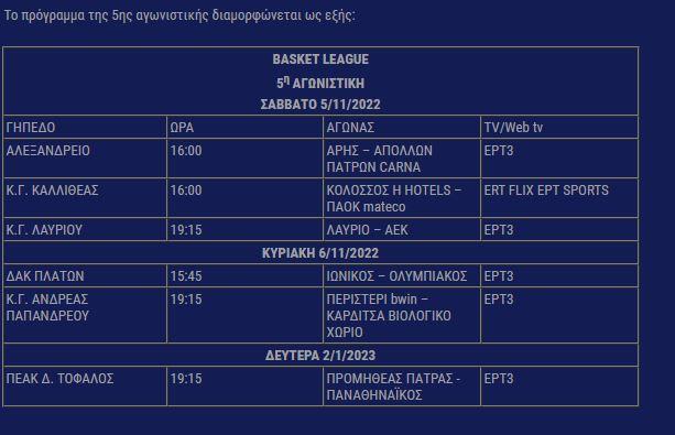 * Ο αγώνας Άρης – Απόλλων Πατρών Carna θα πραγματοποιηθεί στο Αλεξάνδρειο το Σάββατο 5 Νοεμβρίου με ώρα έναρξης τις 16:00 (αντί για τις 15:45) και θα μεταδοθεί live τηλεοπτικά από την ΕΡΤ3.