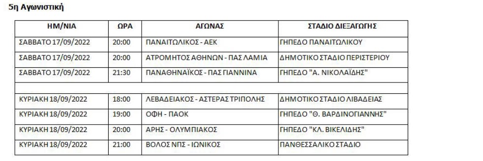 Ανακοινώνεται ότι σε συνέχεια αποδοχής αιτημάτων των τηλεοπτικών παρόχων, τα οποία αφορούν στο πρόγραμμα της 5ης Αγωνιστικής του Πρωταθλήματος Super League, οι αγώνες θα διεξαχθούν ως εξής: