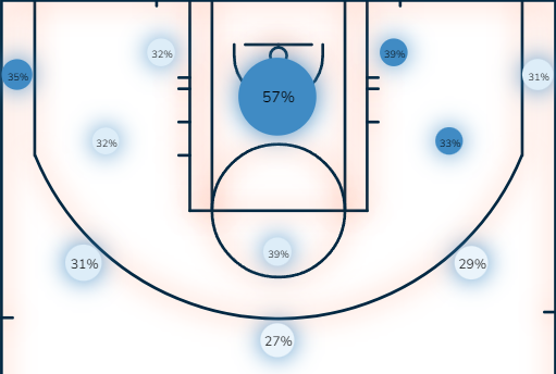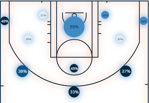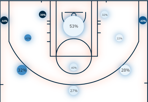 Μεταξύ άλλων έχει ενδιαφέρον ενόψει της σειράς να ρίξουμε μία ματιά στο ποσοστά της ομάδας ανάλογα με το μέρος του γηπέδου από το οποίο σουτάρουν.