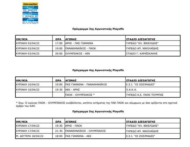 Εγινε γνωστό το πρόγραμμα του Άρη για τις επόμενες 3 αγωνιστικές. Το ματς με τον ΠΑΣ θα γίνει την Κυριακή και τα ντέρμπι με την ΑΕΚ και τον ΠΑΟΚ, θα διεξαχθούν στις 10/4 και 17/4. Ιδού:
