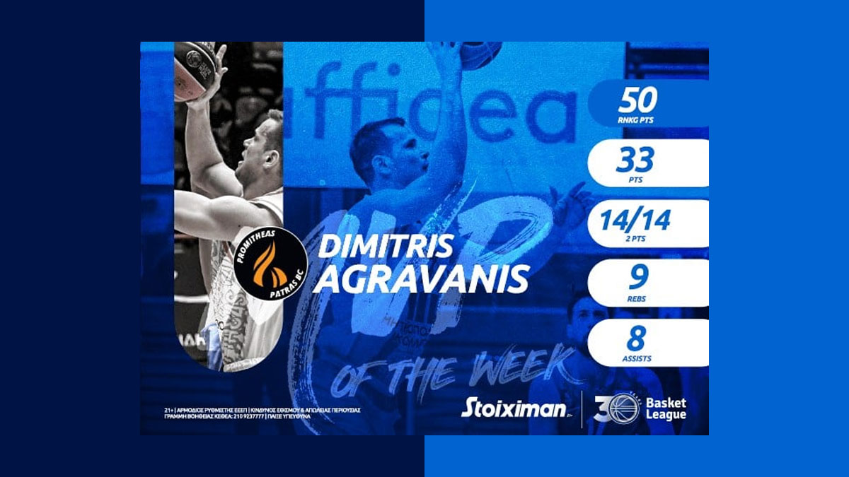 Ο Δημήτρης Αγραβάνης στην εντός έδρας νίκη του Προμηθέα επί του Ιωνικού έγραψε ιστορία καταρρίπτοντας με 14/14 δίποντα το ρεκόρ του Νίκου Γκάλη, που είχε 13/13 δίποντα στο ματς Παναθηναϊκού – ΑΕΚ 91-63 στις 15 Ιανουαρίου 1994, και αναδείχθηκε Stoiximan MVP of the Week!