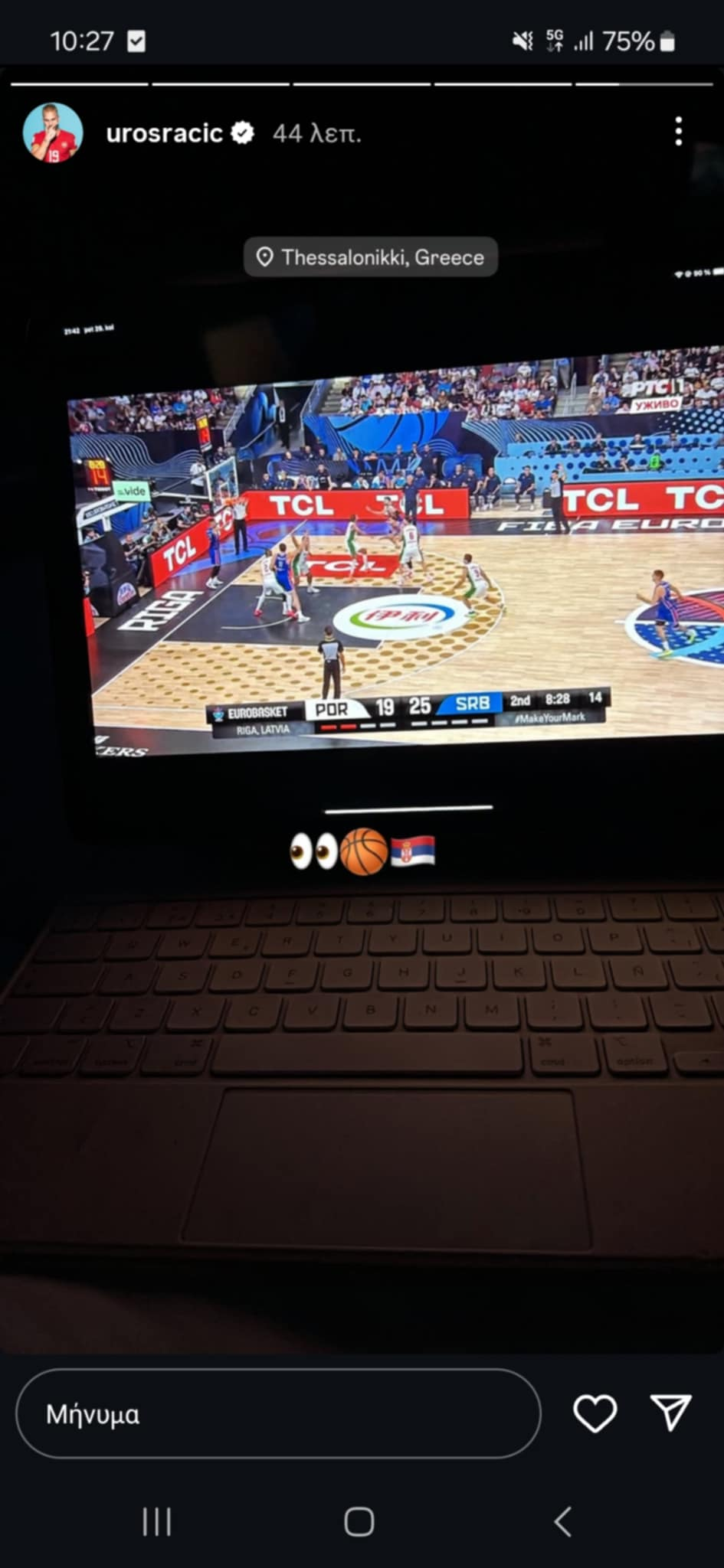 Πριν από όλα αυτά, ωστόσο, αποφάσισε να περάσει τον ελεύθερο του χρόνο παρακολουθώντας την εθνική ομάδα της Σερβίας στο Ευρωμπάσκετ και συγκεκριμένα τη νίκη της ομάδας του Πέσιτς επί της Πορτογαλίας.