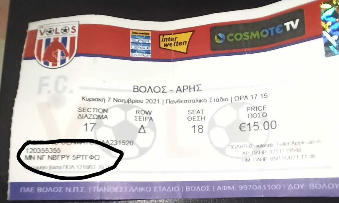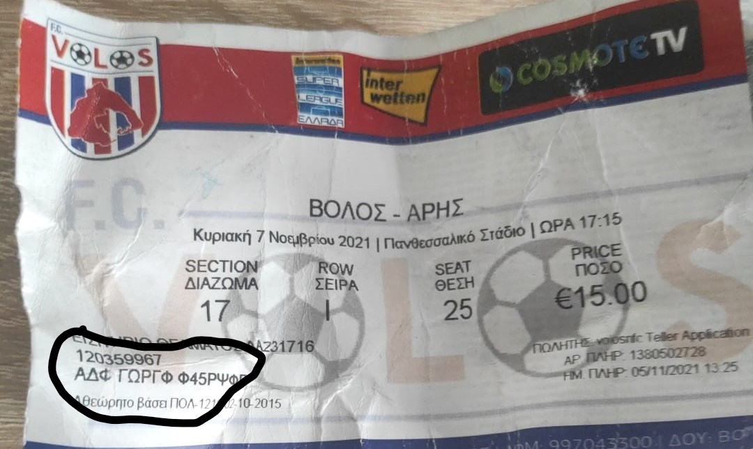 Φυσικά θα πρέπει να εξηγήσει γιατί στα εισιτήρια που πουλήθηκαν στους φίλους του Άρη δεν υπάρχουν ονοματέπωνυμα, κατά παράβαση της νομοθεσίας για τα ηλεκτρονικά εισιτήρια. Όπως βλέπετε στις φωτογραφίες που δημοσιεύουμε, στο σημείο που συνήθως αναγράφεται το ονοματεπώνυμο του κατόχου, υπάρχουν διάφορα γράμματα, που δεν βγάζουν κάποιο νόημα.