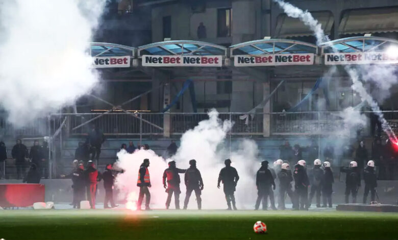 Στη συνέχεια, υπήρξε ένταση προσωρινά, με την Αστυνομία να επεμβαίνει και να ρίχνει κρότου λάμψης, ενώ ακολούθως διμοιρίες των ΜΑΤ παρατάχθηκαν στα όρια του αγωνιστικού χώρου. Παράλληλα, έσπασαν και κάποια καθίσματα στο πέταλο της θύρας 1.