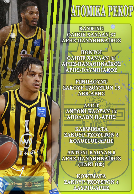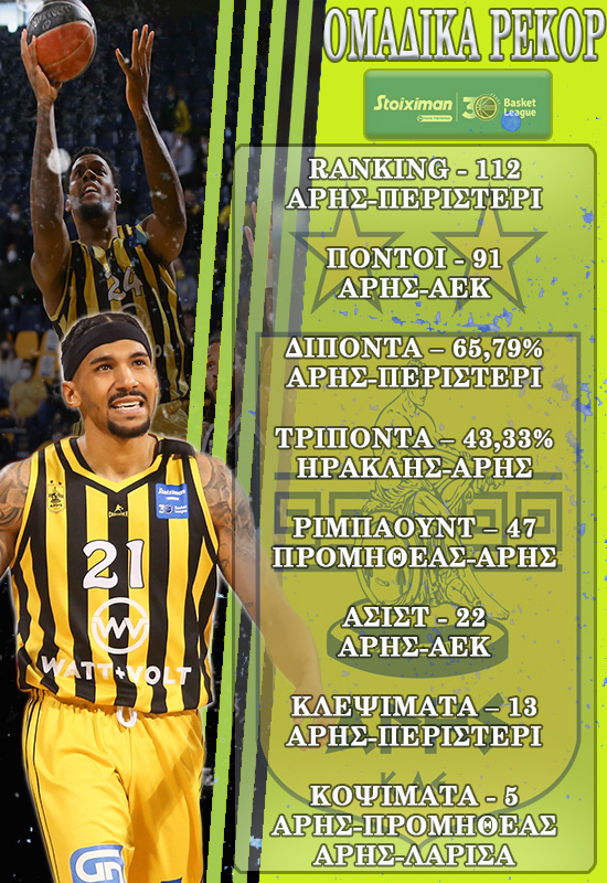ΤΑ ΡΕΚΟΡ: Στη διαδρομή των 26 αγώνων του στην 30ή Stoiximan Basket League, οι επιδόσεις της μιας βραδιάς που ξεχώρισαν σε ατομικό και ομαδικό επίπεδο για τον Άρη ήταν…
