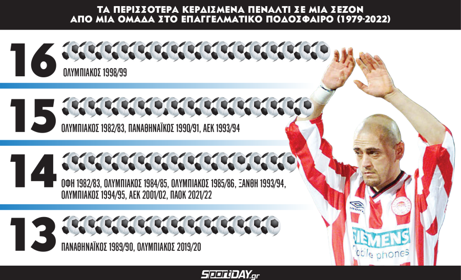 Στις 42 προηγούμενες σεζόν της Α’ Εθνικής και της Super League, το ρεκόρ περισσότερων κερδισμένων πέναλτι σε μια σεζόν κατέχει ο Ολυμπιακός από την περίοδο 1998-99 με τους “ερυθρόλευκους” να έχουν εκτελέσει συνολικά 16 πέναλτι σε πρωτάθλημα 18 ομάδων και 34 αγωνιστικών. Ο ΠΑΟΚ, ήδη, έχει 15 κερδισμένα πέναλτι και βάζει πλώρη για να “πιάσει” ένα ιστορικό ρεκόρ κερδισμένων πέναλτι σε μια σεζόν.