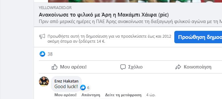 Ο Ερέζ Χακατάν είναι γνωστός για την… τρέλα που έχει για τον Άρη. Ο Ισραηλινός, που έχει βρεθεί σε ουκ ολίγους αγώνες των “κιτρίνων, παρακολουθεί τις καθημερινές εξελίξεις του αγαπημένου του Άρη και θέλησε να αναφερθεί στο φιλικό με την Μακάμπι Χάιφα.
