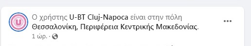 Μια ιδιαίτερη ανάρτηση έκανε η Κλουζ το βράδυ της Τρίτης, παραμονές του αγώνα με τον Άρη στο Παλέ. Αναφέροντας αρχικά πως… “ο χρήστης U-BT Cluj-Napoca είναι στην πόλη Θεσσαλονίκη, Περιφέρεια Κεντρικής Μακεδονίας”, “ανέβασε” την παρακάτω φωτογραφία, με το σχόλιο: “Απλά μια ευγενική υπενθύμιση ότι ερχόμαστε από την Τρανσυλβανία…”.