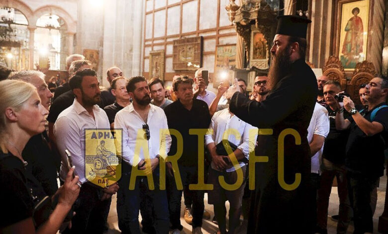 Η αποστολή του Άρη πριν το παιχνίδι με την Μακάμπι Τελ Αβίβ επισκέφθηκε τον Πατριάρχη Ιεροσολύμων Θεόφιλο Γ’ κι έκανε κατάνυξη στους Αγίους Τόπους.