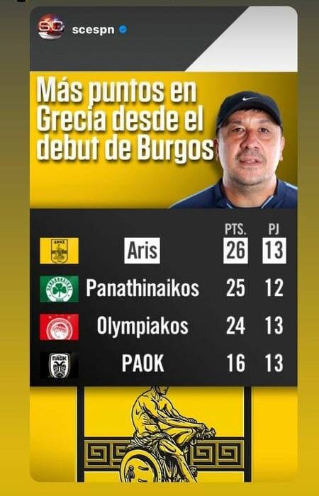 Mια ιδιαίτερη ανάρτηση που “δείχνει” την πρωτιά που έχει ο Άρης με τον Χερμάν Μπούργος ως προπονητή, έκανε ο Αργεντινός τεχνικός. Στο διάστημα της θητείας του, οι “κίτρινοι” συγκέντρωσαν 26 βαθμούς, περισσότερους από κάθε άλλη ομάδα. Δείτε την σχετική φωτογραφία, με την υποσημείωση πως στους αγώνες του Παναθηναϊκού, υπάρχει το λάθος ότι γράφεται 12 αντί για 13 ματς.