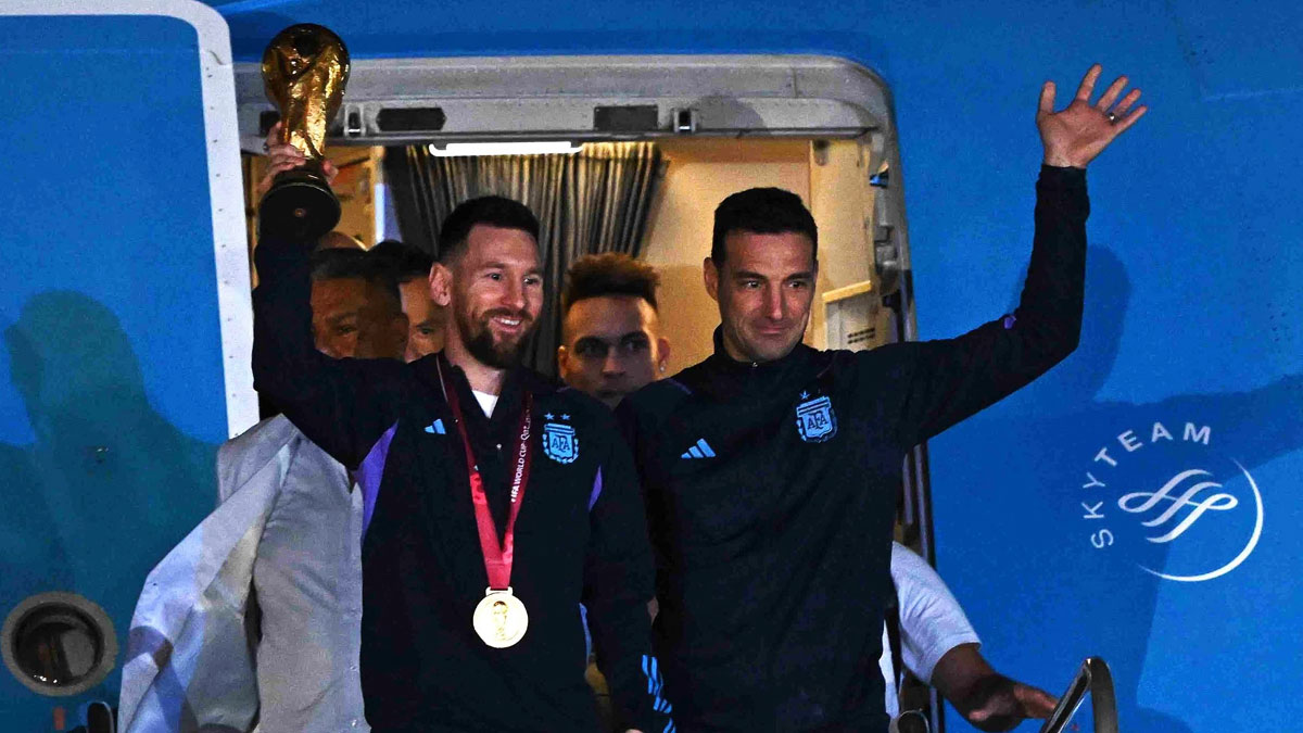 Ο Λιονέλ Μέσι, ο εμβληματικός αρχηγός της «αλμπισελέστε» στο Μουντιάλ του Κατάρ, ήταν ο πρώτος που εμφανίσθηκε στην σκάλα του αεροσκάφους, κραδαίνοντας το χρυσό τρόπαιο του Παγκοσμίου Κυπέλλου, για να περπατήσει λίγο αργότερα στο κόκκινο χαλί που απλώθηκε στον διάδρομο του αεροδρομίου Εζέϊζα.