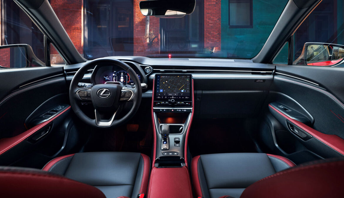 Στο εσωτερικό, η πολυτέλεια συνδυάζεται με τη σπορ διάθεση μέσω επένδυσης από δέρμα ημί-ανιλίνης σε μαύρο, με λεπτομέρειες σε Dark Rose που δημιουργούν έντονη αντίθεση. Οι κόκκινες διπλές ραφές Tatami στα καθίσματα, οι ζώνες ασφαλείας σε Dark Rose και η προσοχή στη λεπτομέρεια αναδεικνύουν την premium κατασκευή της Lexus.