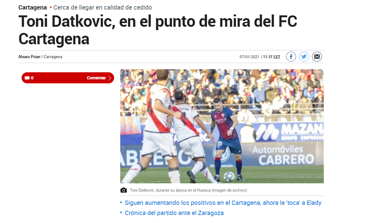 Με τον δανεισμό του Ντάτκοβιτς η Καρταγένα θα ενισχύσει την άμυνα της για τον δεύτερο γύρο της La Liga. Θα είναι η πρώτη της κίνηση τον Ιανουάριο.»
