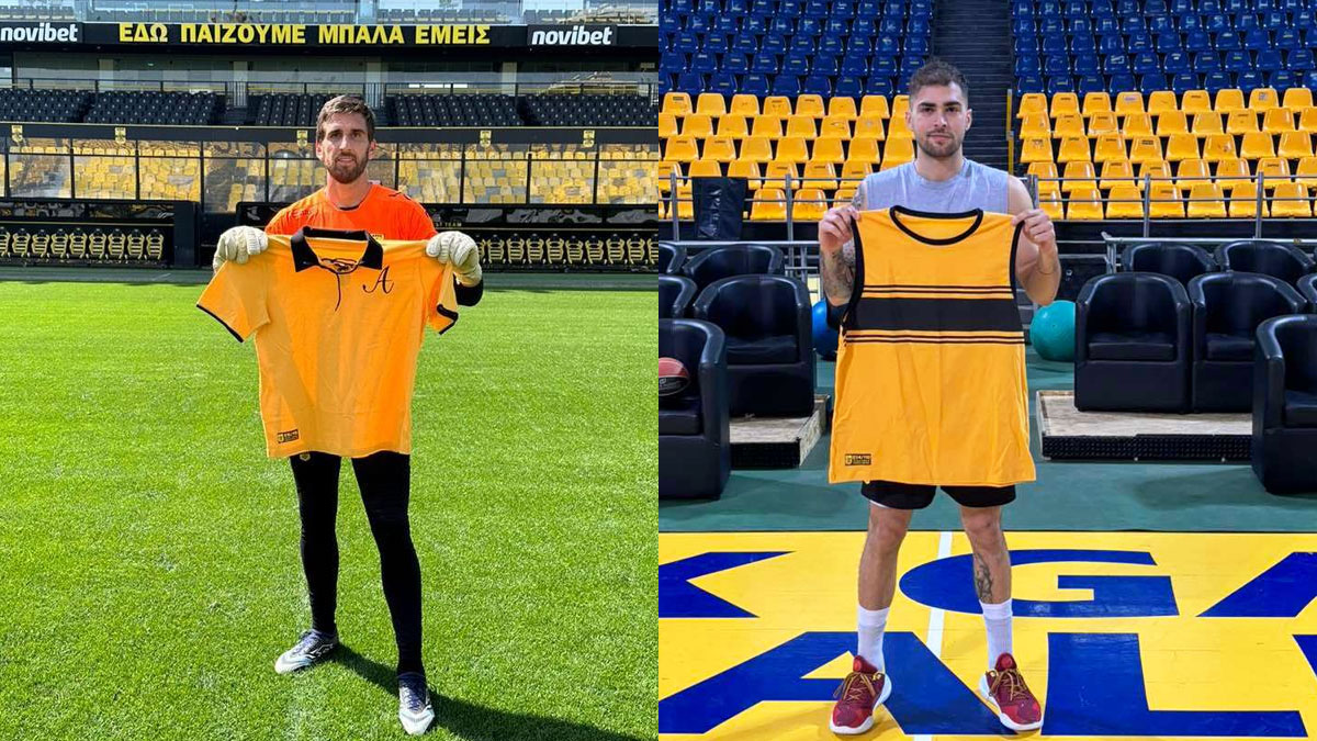 Οι αρχηγοί, Χουλιάν Κουέστα και Βασίλης Τολιόπουλος, φωτογραφήθηκαν με τις επετειακές φανέλες ποδοσφαίρου και μπάσκετ αντίστοιχα και καλούν τους φίλους του Άρη να τις προσθέσουν στη συλλογή τους.